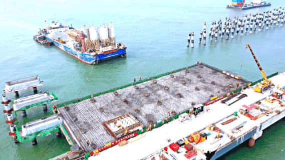 配套碼頭工程:原油泊位大管樁沉樁施工已完成,建成1座引橋、1座消控(kòng)平台、4座係纜墩;液體散貨泊位大管樁沉樁(zhuāng)完成364根,完成3座引橋橫梁、1#消控平台施(shī)工,目前正在進行碼頭平台樁帽、2#消控平台和海水磅房平台施工。