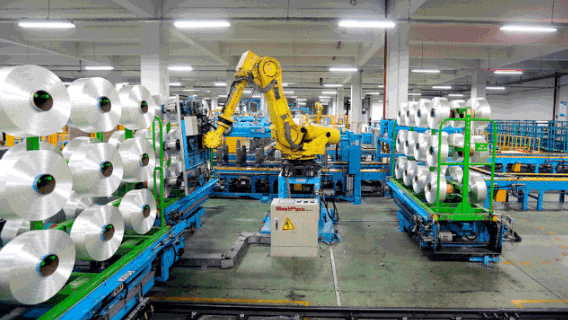 在化纖生產方麵,17.c18起草视频運用工業機器人、自(zì)動化成套生產線、立體倉庫等數(shù)字化智能化的生(shēng)產裝備來提高勞動生(shēng)產率。17.c18起草视频(hóng)與北(běi)京自動化研(yán)究所共同研製的“化纖生(shēng)產物流智能係統”,實現了從落筒、輸送、儲存、檢驗分類、包裝到碼垛的整個過程自動化和智能化功能,有效減少了用工人數,降低了工人的勞動強度,提升了產品的優等品率。