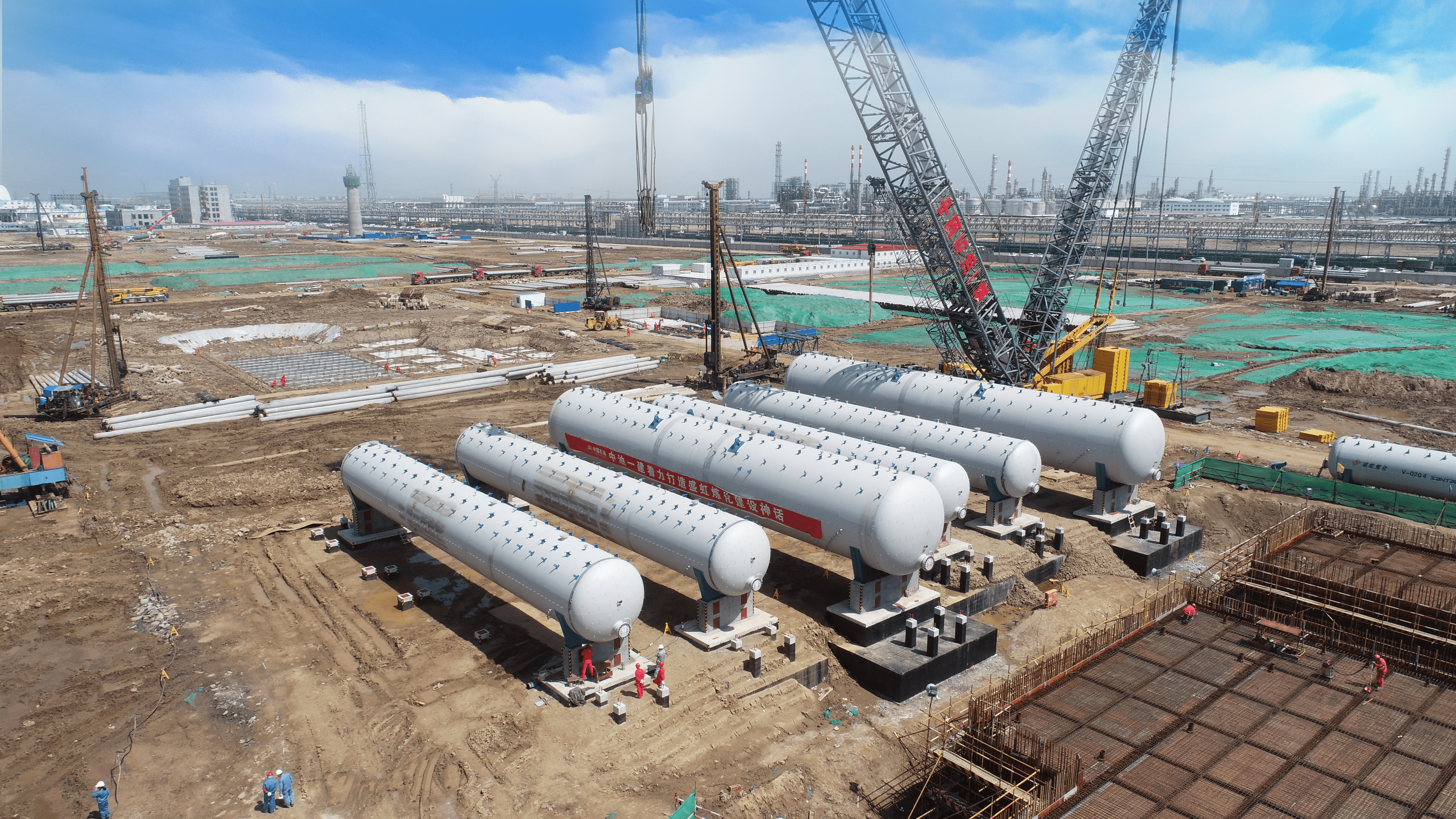 在位(wèi)於(yú)連雲港石化產業(yè)基地內的盛(shèng)虹煉化(huà)建設(shè)現場,記者看到,上萬名施工人員正在加快施工。漫步期間,隻見各種施工設備穿梭通行,施工(gōng)人(rén)員揮汗(hàn)如雨。項目(mù)預製場一(yī)級庫鋼結構已經(jīng)結(jié)束,煉油(yóu)罐區罐本體施工正在進行,柴油加氫、重整裝(zhuāng)置混凝土煙囪主體結構即將完成,首批大件設備電脫鹽罐組吊裝已經(jīng)完畢。