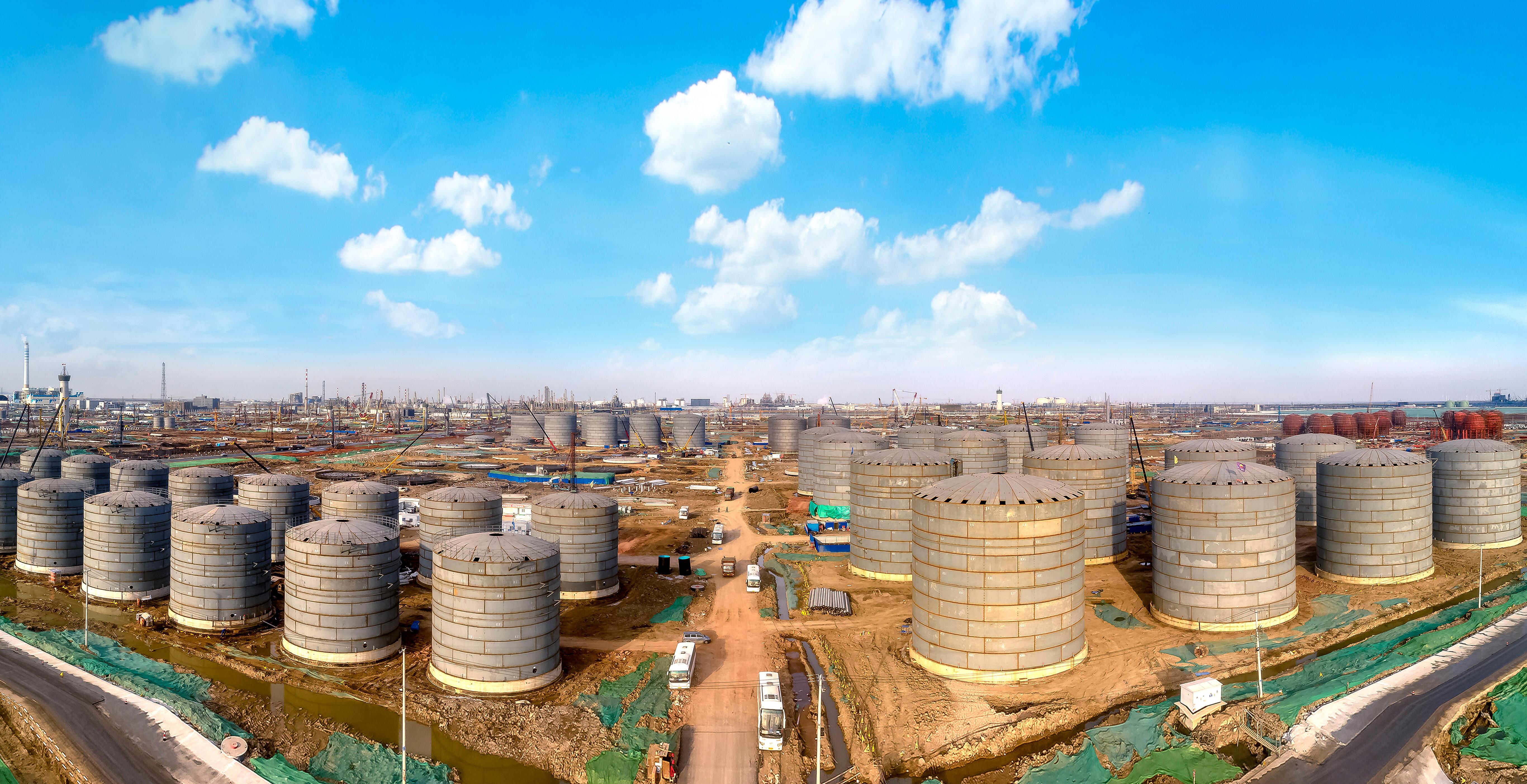 廠(chǎng)內及廠外罐區100餘台儲罐完(wán)成主體結構施工,罐區參建人員已增加至3200餘人。