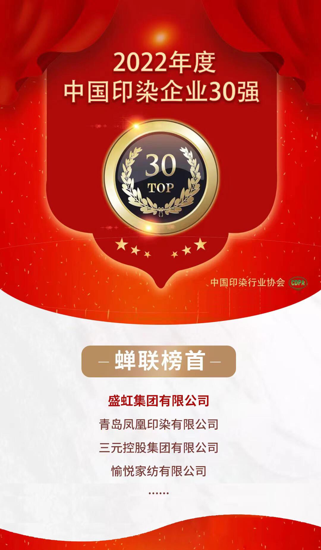 “2022年度中國印染企業30強”榜單是綜合考評企業規(guī)模、經濟效益、社會責任、創新能力以及節能環保等情況評比得出,目的是引導我國印染行業企業加快改革(gé)創新和轉型升級步伐,提高國際競爭力,實現(xiàn)高質量發展(zhǎn)。