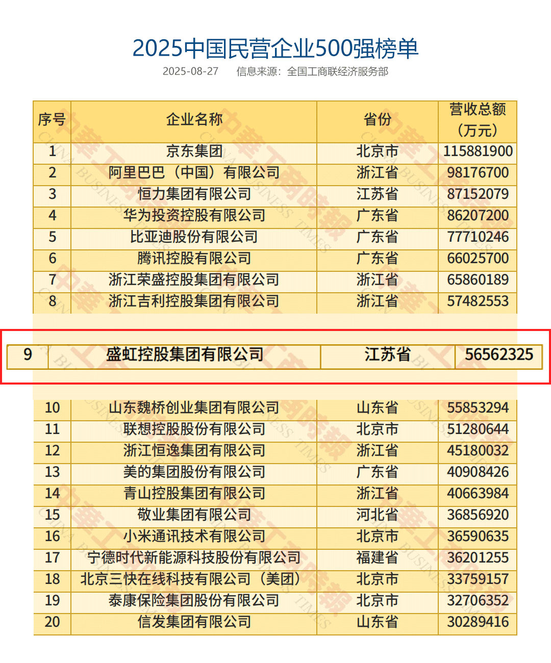 盛(shèng)虹位居中國民營企業(yè)500強(qiáng)第9位(wèi)
